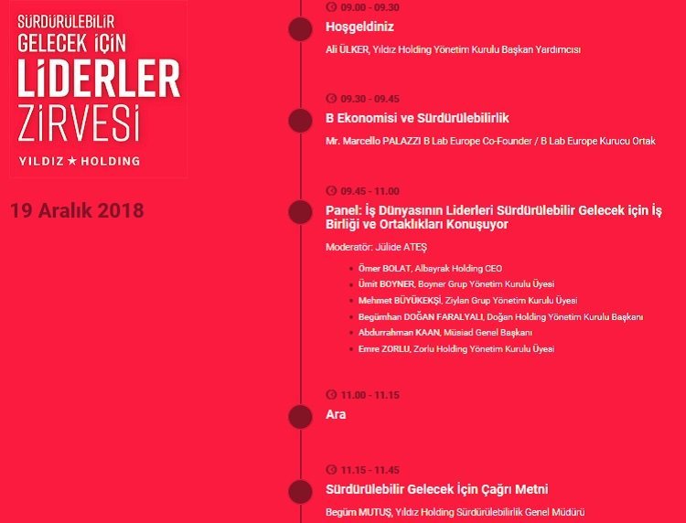 Yıldız Holding Sürdürülebilirlik Platformu ev sahipliğinde ve B Lab Avrupa işbirliğinde düzenlenen Sürdürülebilir Gelecek İçin Liderler Zirvesi, 19 Aralık’ta İstanbul Fairmont Quasar Otel’de yapılacak.